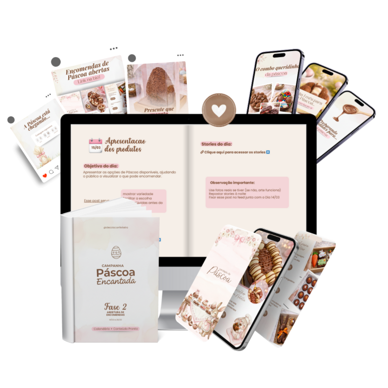 Um kit completo com 30 dias de conteúdo estratégico, criado especialmente para confeiteiras que querem: